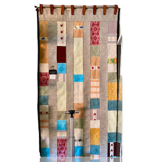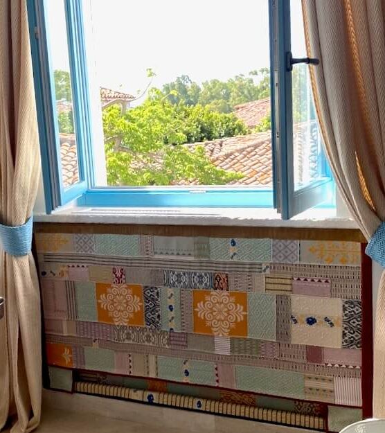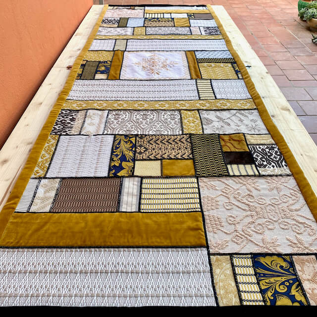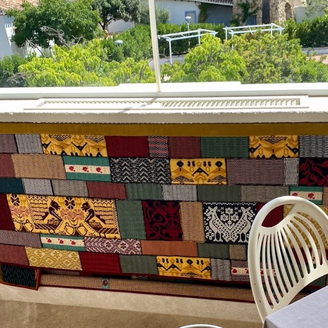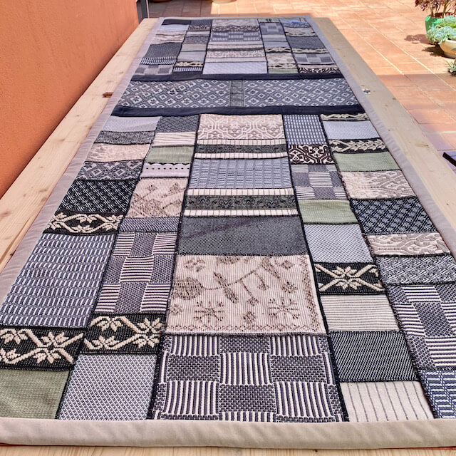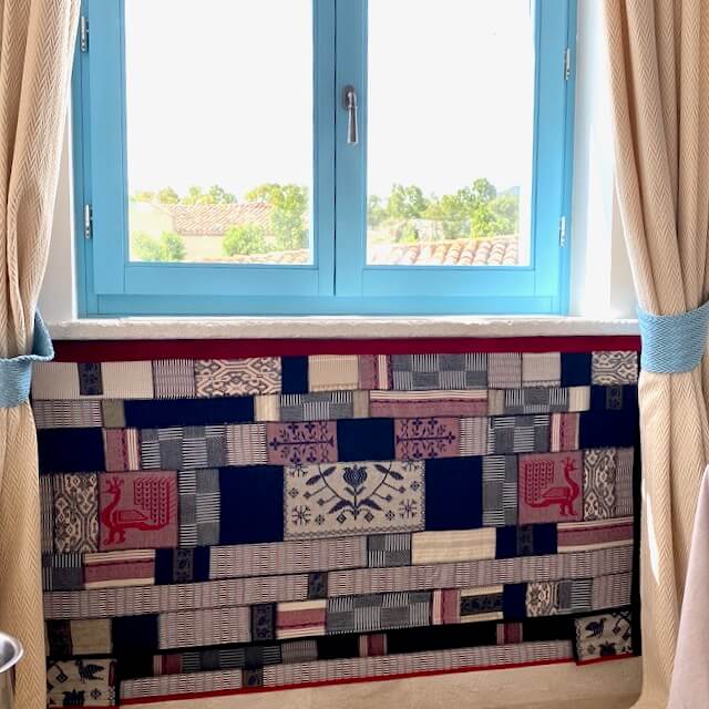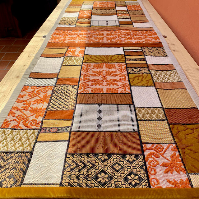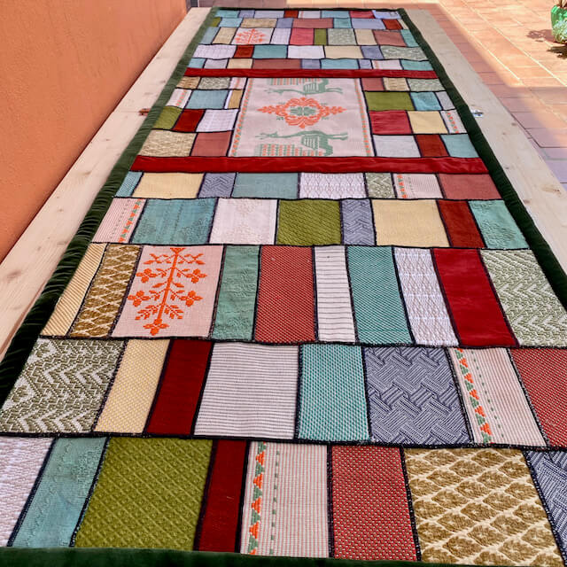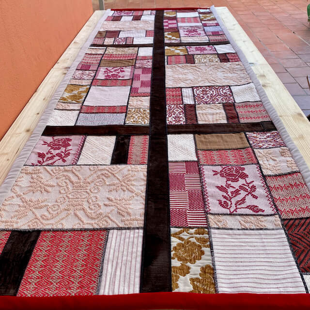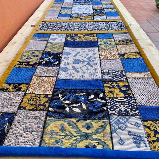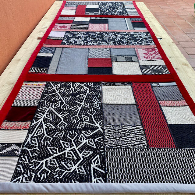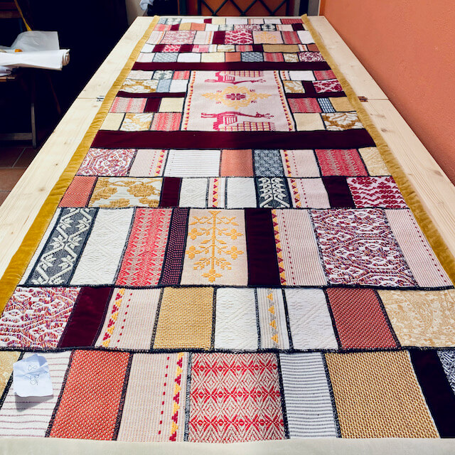 L’arazzo “Sa Manta” è realizzato da Michaela Vargiu con piccoli ritagli di tessuto sardo creati a telaio accuratamente selezionati e abbinati seguendo il gusto cromatico tipico della Designer.