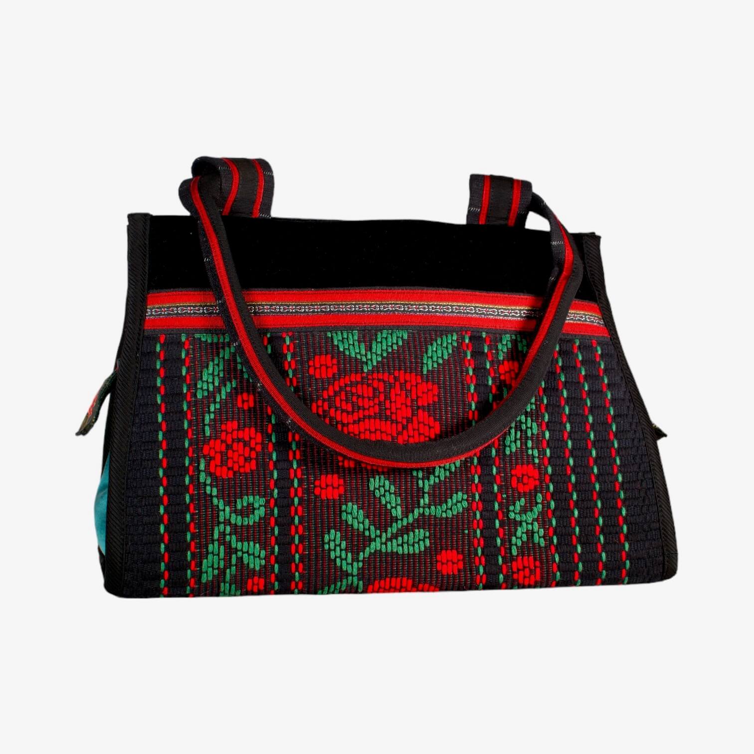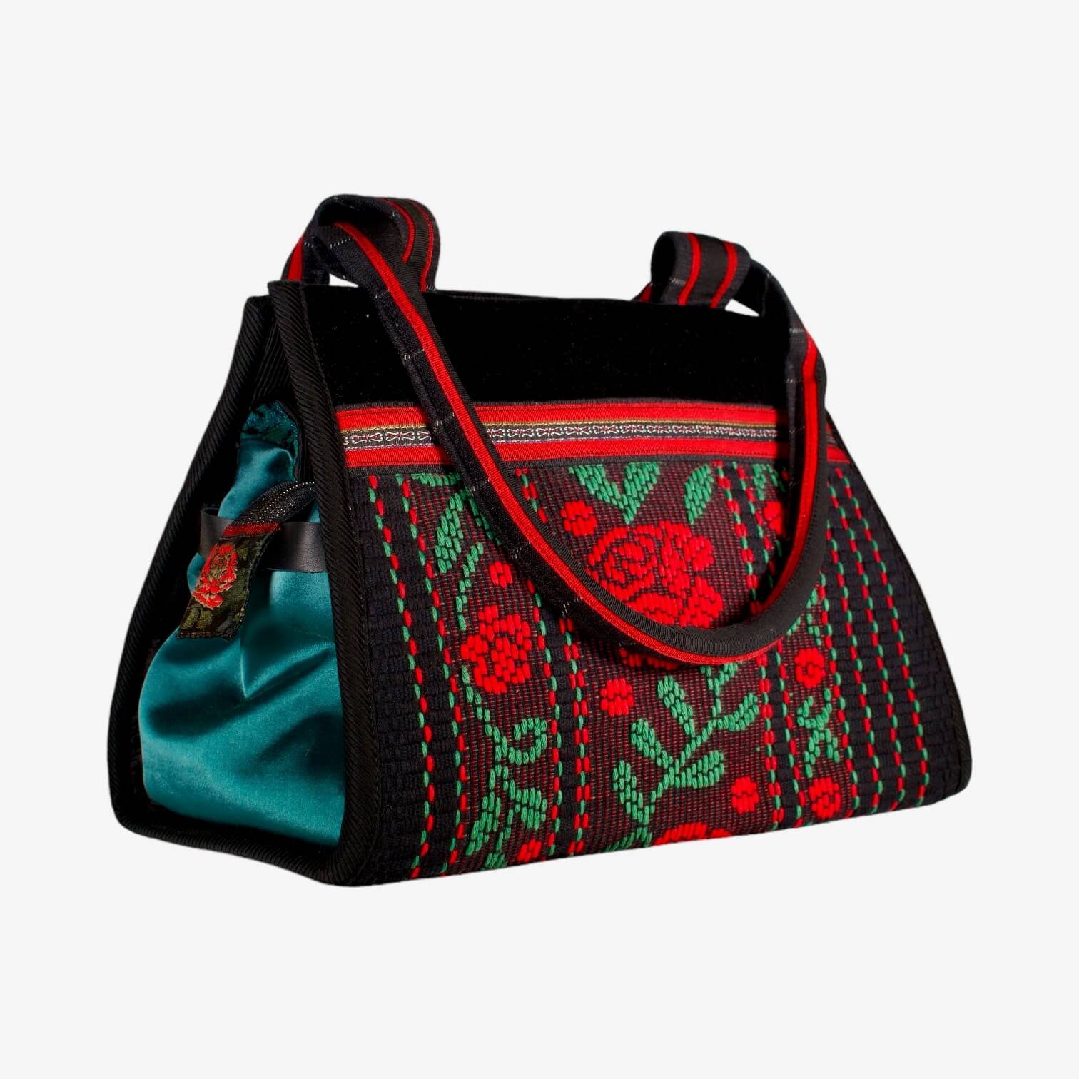 Questa borsa è realizzata con dei pannelli di tessuto sardo fatti a telaio, rifinita con dei nastri in broccato.