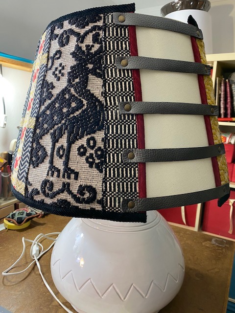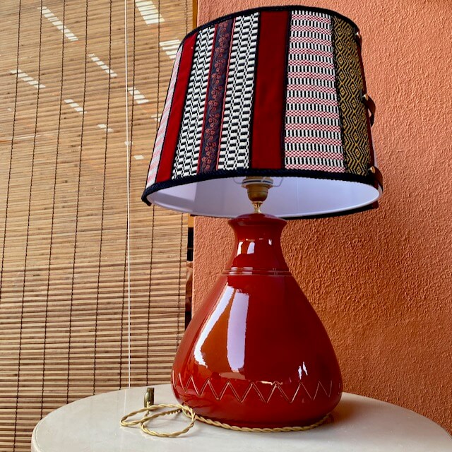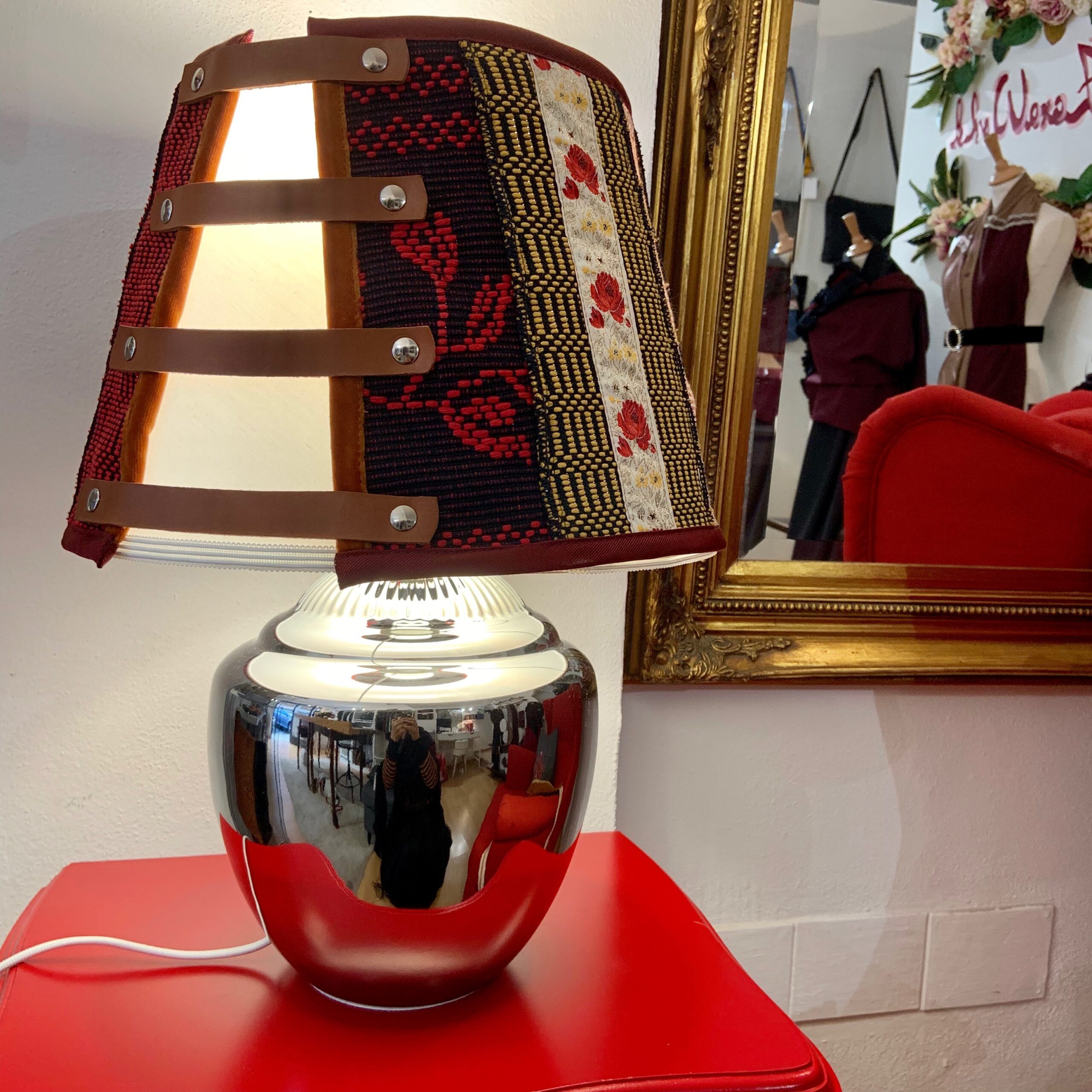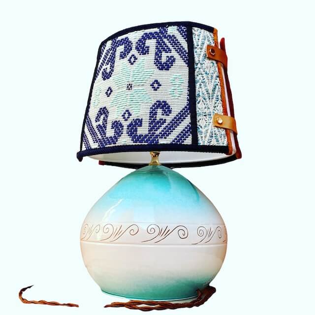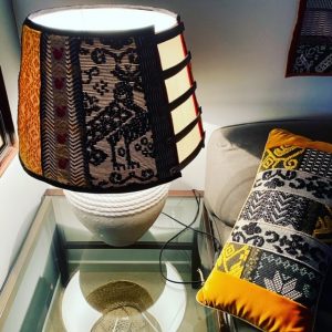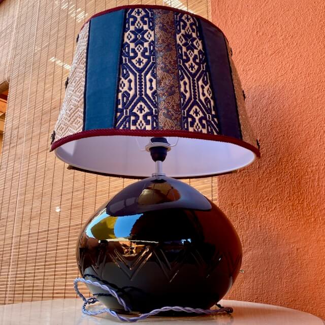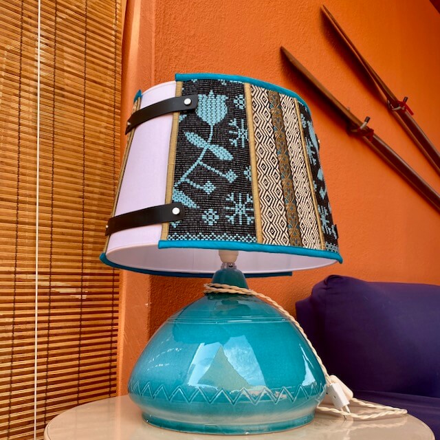 La lampada con il suo paralume “Sa Luxi Noba” viene realizzata con velluti, broccati , tessuti sardi fatti a telaio e arricchiti da lacci di cuoio e borchie che conferiscono un tocco moderno e di designer.