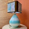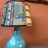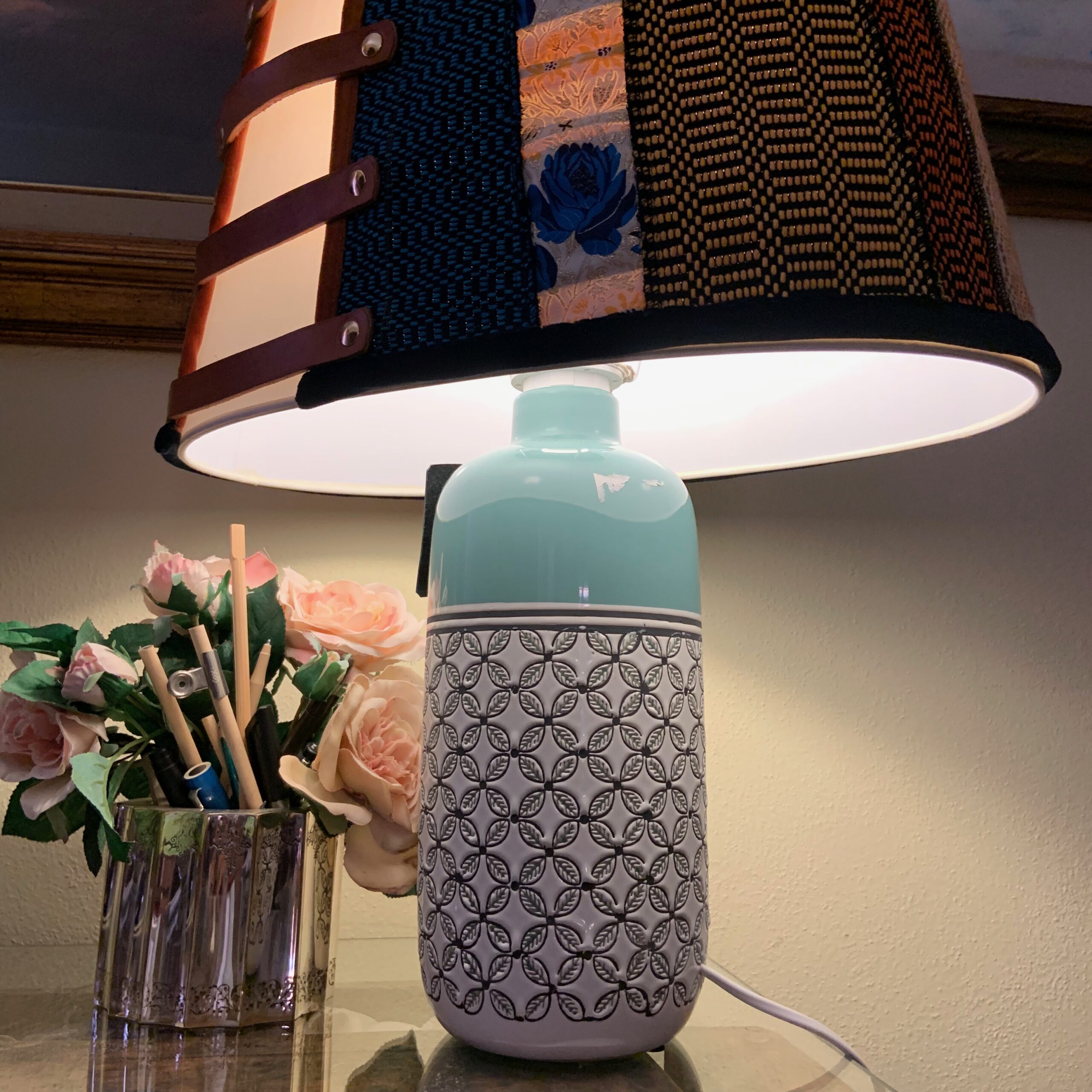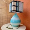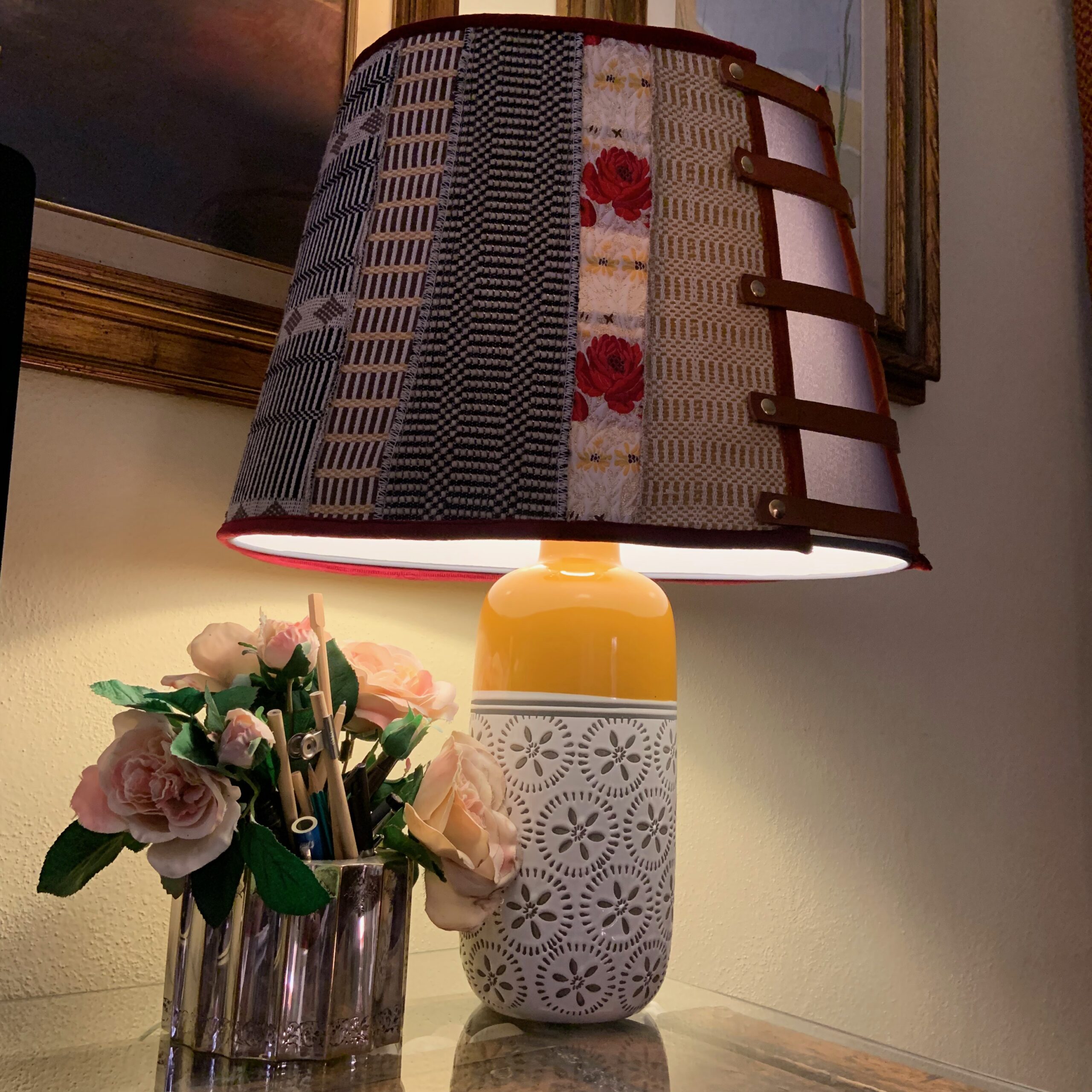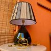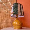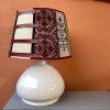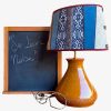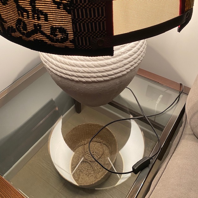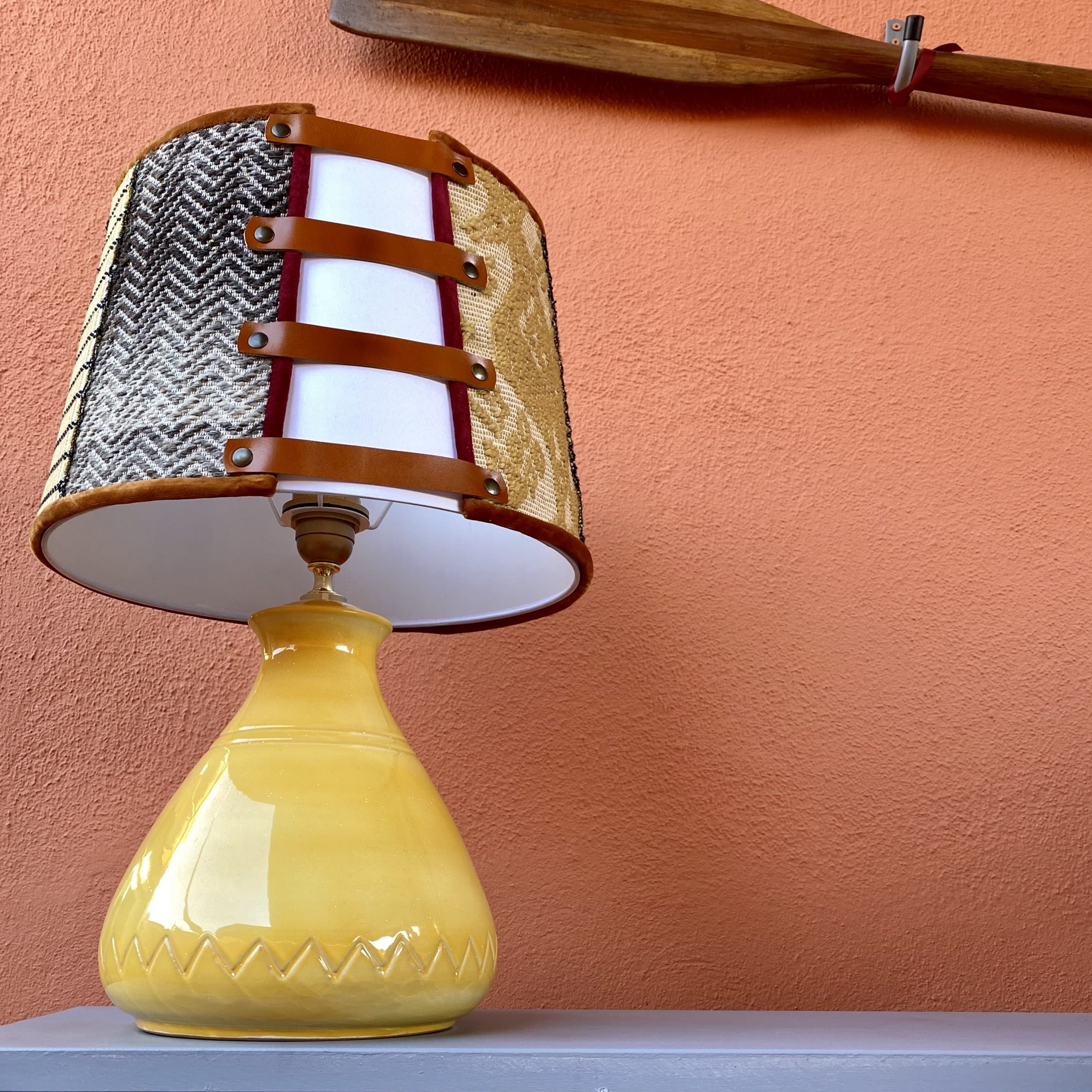 La lampada con il suo paralume “Sa Luxi Noba” viene realizzata con velluti, broccati , tessuti sardi fatti a telaio e arricchiti da lacci di cuoio e borchie che conferiscono un tocco moderno e di designer.