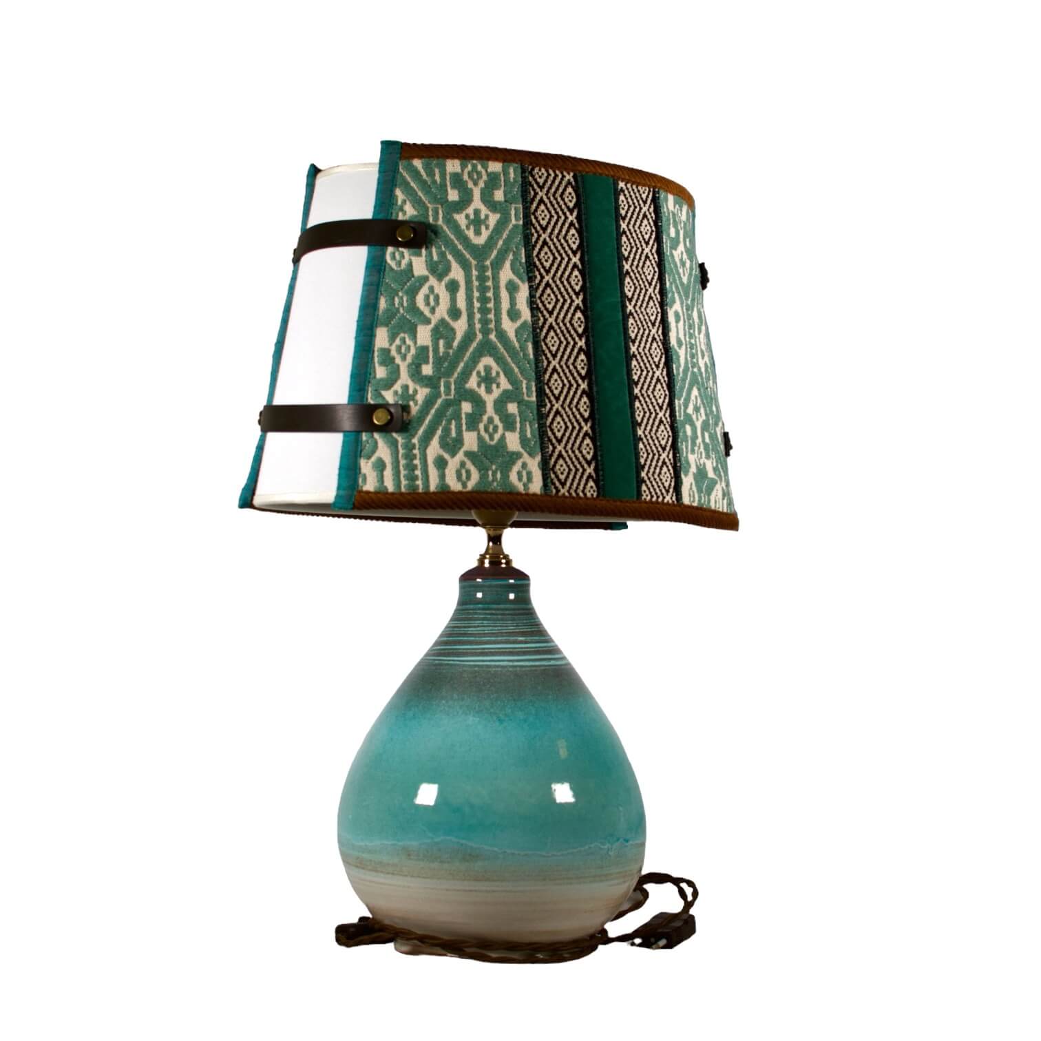 La lampada con il suo paralume “Sa Luxi Noba” viene realizzata con velluti, broccati , tessuti sardi fatti a telaio e arricchiti da lacci di cuoio e borchie che conferiscono un tocco moderno e di designer.