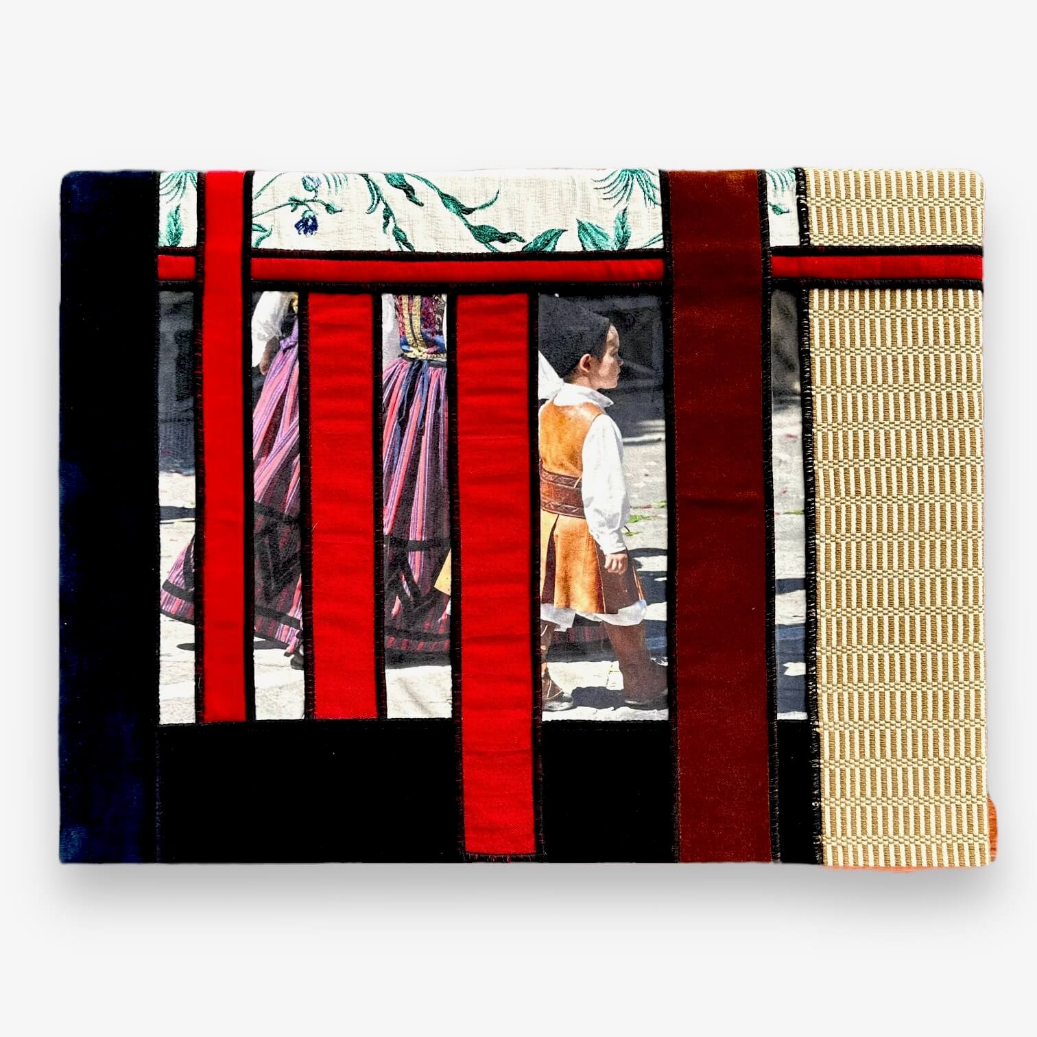 Il quadro “Sa Manta” è realizzato da Michaela Vargiu con piccoli ritagli di tessuto sardo creati a telaio accuratamente selezionati e abbinati seguendo il gusto cromatico tipico della Designer.